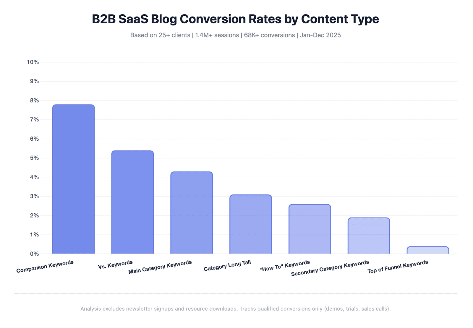 Start at the bottom of the funnel. Build comparison pages, target competitor alternative keywords, and category-for-use-case content before touching educational topics. MOFU comes second. TOFU comes last, if at all.