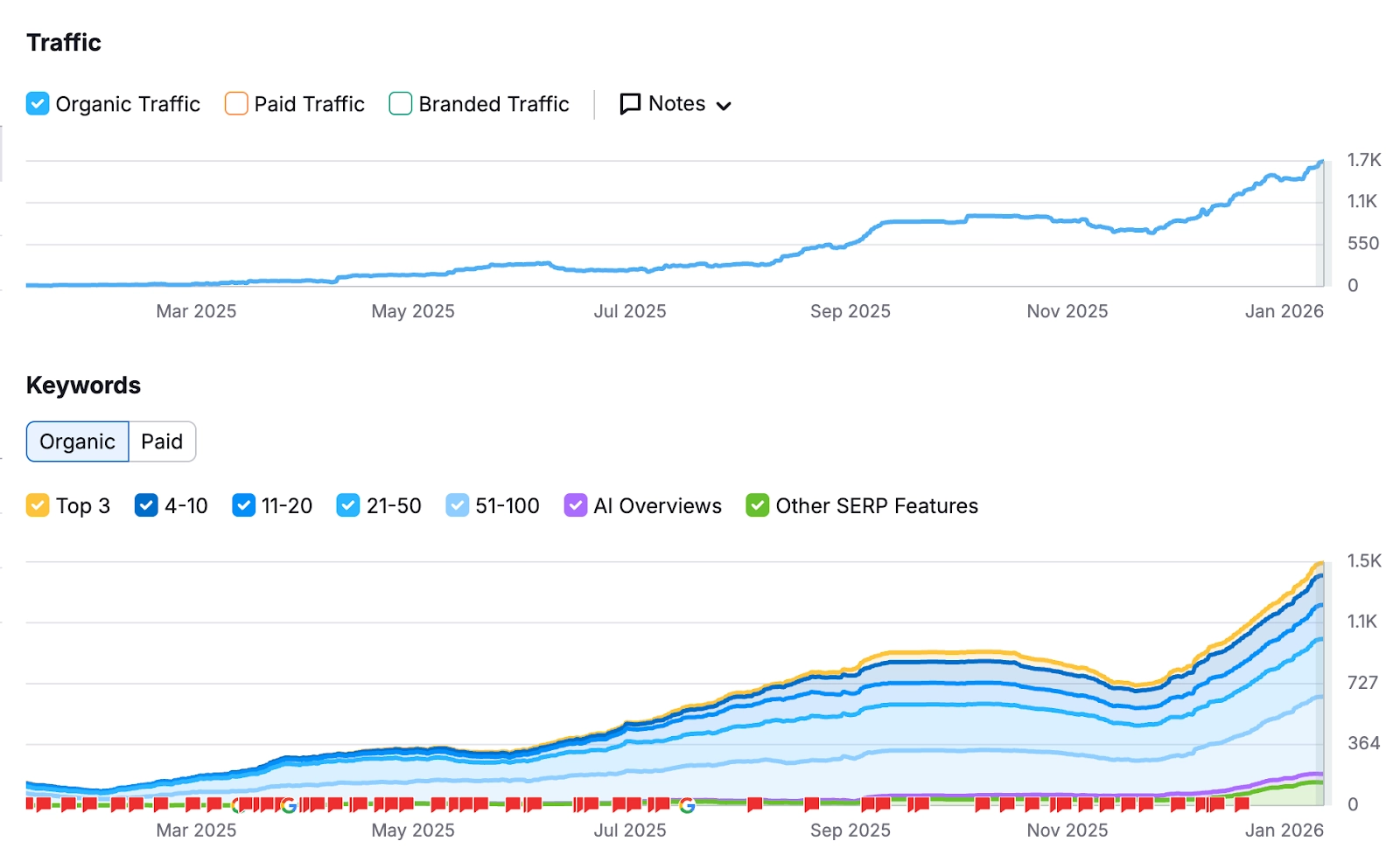 The solution was building a strategy around commercial topics with low competition. 12 months in: