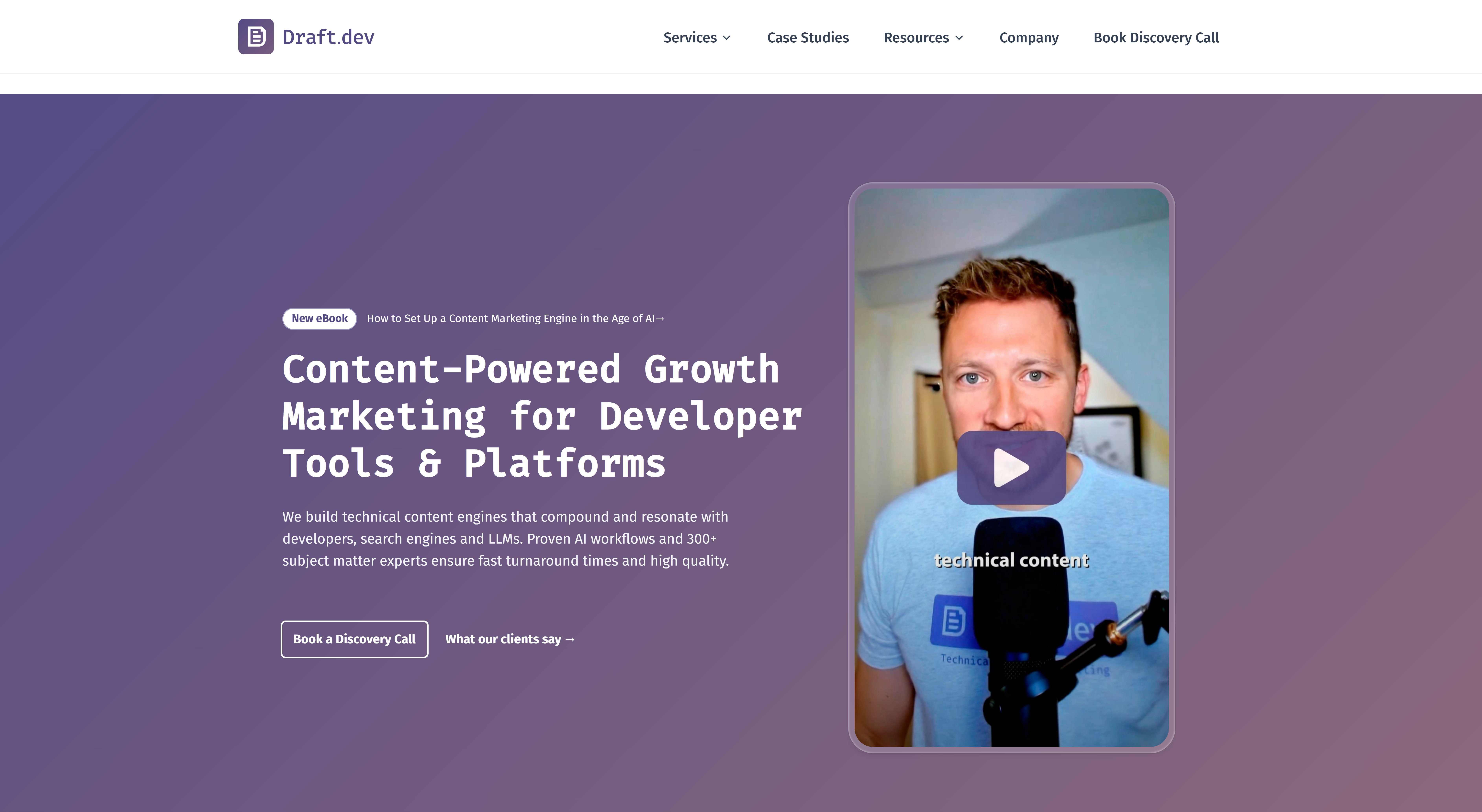 Draft.dev is a content marketing agency focused exclusively on technical content for developer tools and platforms. Founded by Karl Hughes (former CTO), they solve a specific problem: companies struggle to produce technically accurate developer content because internal engineering teams are busy building products, and generalist agencies can't match the technical depth developers expect.