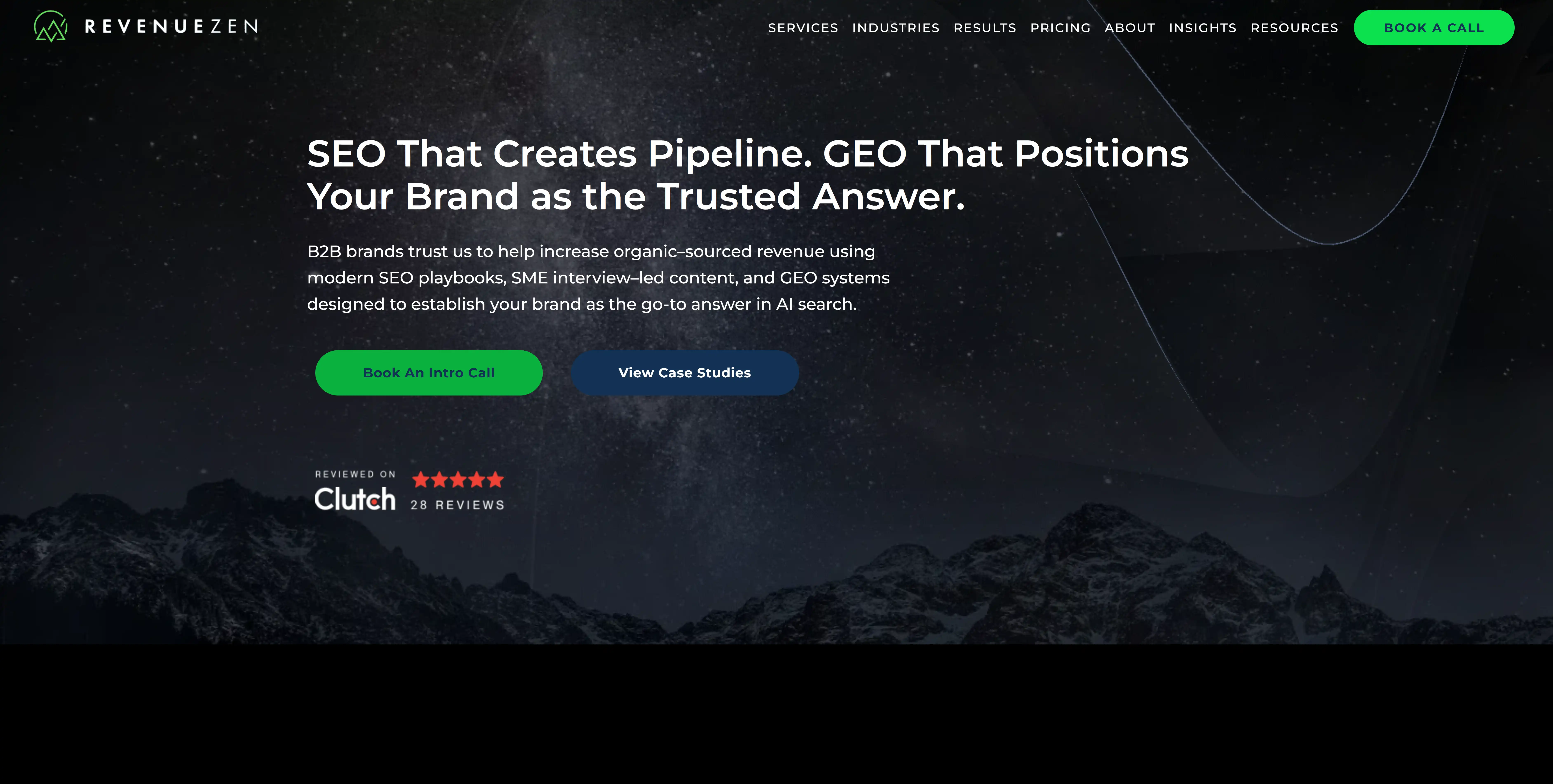 RevenueZen is a GEO-focused B2B SEO agency specializing in helping B2B SaaS, IT, and technology companies grow organic-sourced ARR. Acquired by Onfolio Holdings (NASDAQ: ONFO), they position around pipeline and revenue outcomes rather than rankings or traffic, with methodology tied to CRM tracking of closed deals.