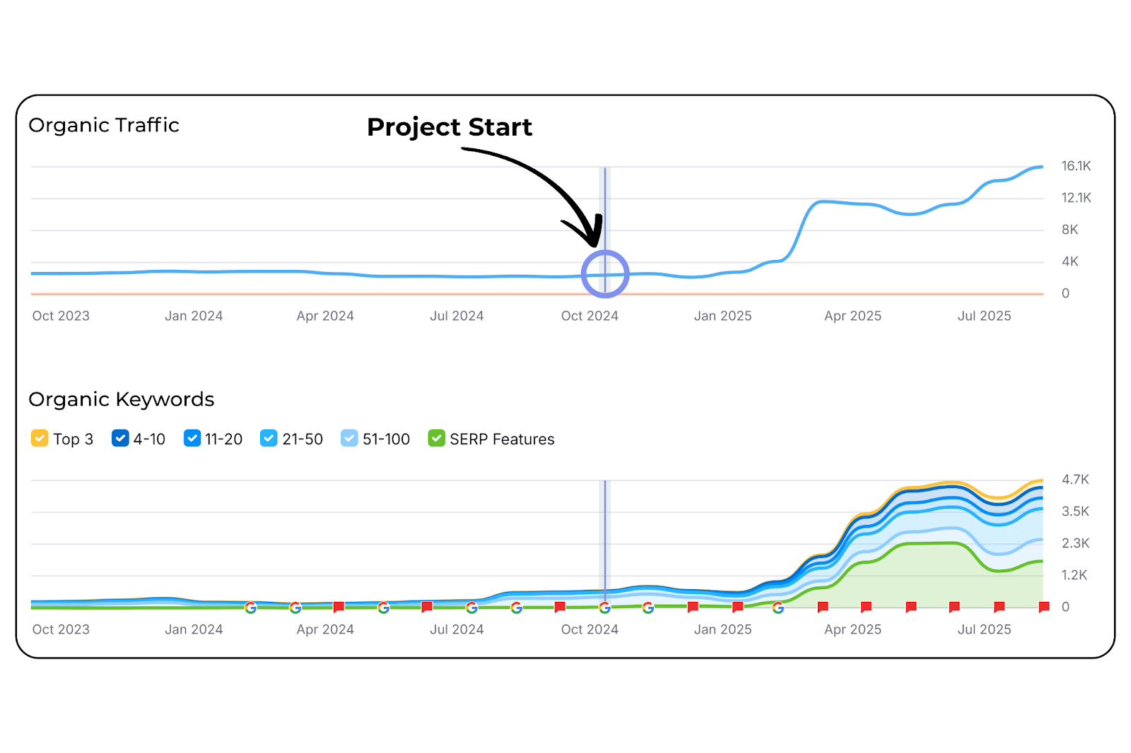 - Monthly Organic Traffic: 2,500 → 16,100+ (544% increase)